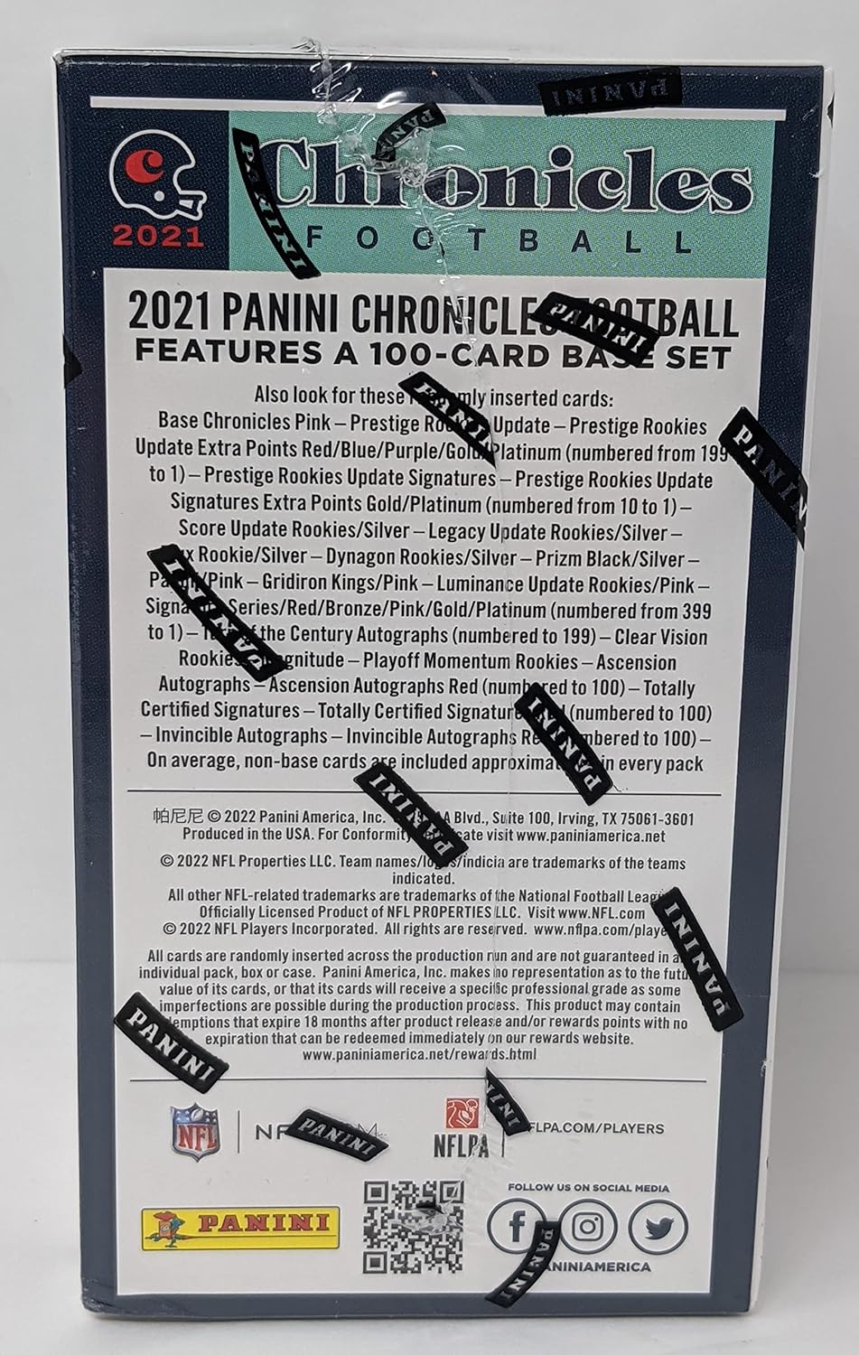 2021 Panini Chronicles Football Blaster Box Trading Cards. Showcasing many different NFL card brands, the 2021 Panini Chronicles Football offers new cards for the 2021 Rookie Class and season. Chronicles product is all about variety. Features a 100-card Base Set including the brightest rookies. Also the top stars in today’s NFL. Also, look for these randomly inserted cards: Base Chronicles Pink, Prestige Rookies Update, and much more. Look for Blaster exclusives!